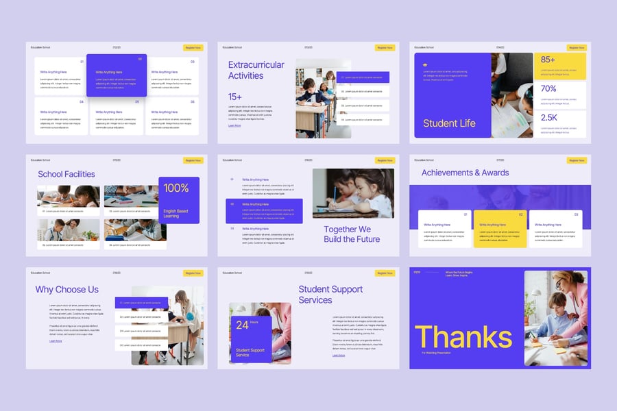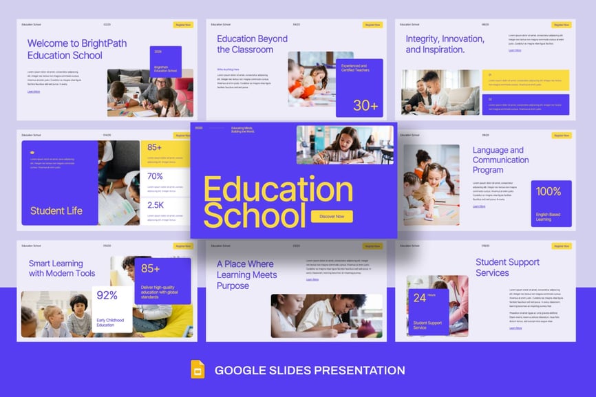 **教育机构谷歌幻灯片模板** 这款演示文稿模板设计简洁易用,方便您根据自身需求进行编辑和调整。它适用于任何商业项目,定能让您的演示脱颖而出,给观众留下深刻印象。