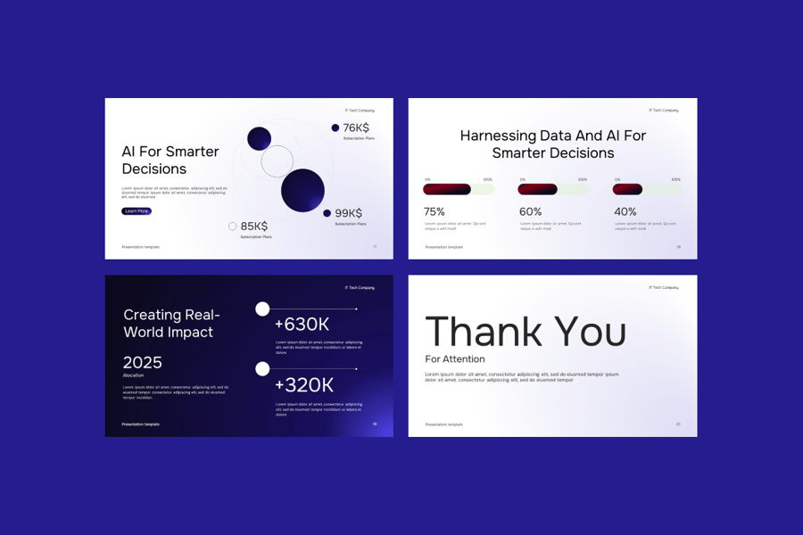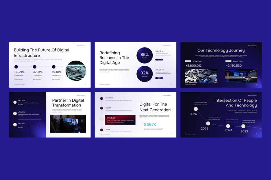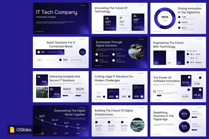使用专为现代科技公司、初创企业、SaaS平台、数字机构和IT服务提供商设计的IT技术公司谷歌幻灯片演示模板,提升您的商务演示效果。这套简洁、专业且充满未来感的幻灯片模板,能够帮助您清晰有力地展示公司简介、服务、创新路线图、数据分析和项目流程。