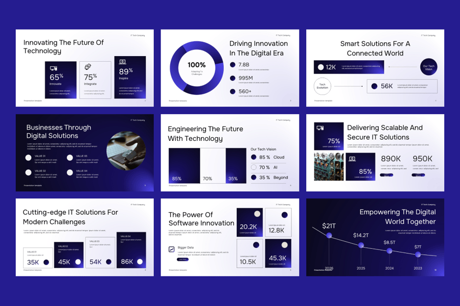 这款模板拥有完全可编辑的幻灯片,采用简洁的科技美学设计、醒目的字体、渐变配色方案和直观的布局,可提升您品牌的数字化形象。无论您是向投资者推介、展示新软件、宣传您的IT解决方案,还是准备客户提案,这款模板都能确保您的信息在视觉上引人注目且易于理解。