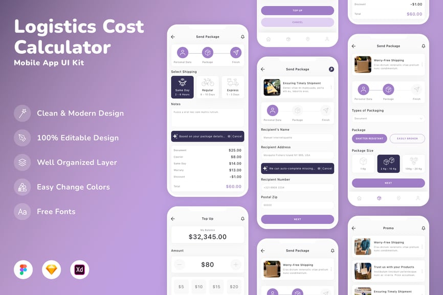 当前位置:首页UI素材Ui Kits物流成本计算器移动应用 UI 套件