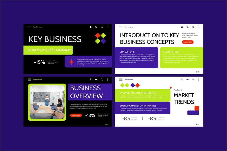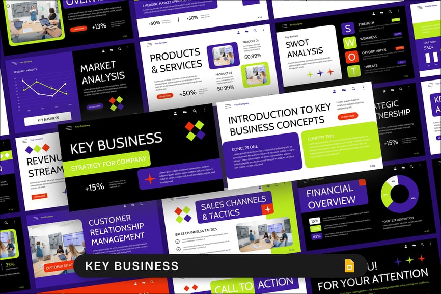 使用这款“关键业务”Google幻灯片演示模板,释放您演示的无限潜力。该模板设计精巧、功能全面,适用于企业会议、商业提案、创业路演、公司简介和战略演示。模板采用简洁现代的幻灯片布局,包含业务概览、SWOT分析、财务报告、营销策略、团队介绍、时间轴、信息图表和关键数据图表。其简约时尚的设计风格,助您清晰传达理念,同时牢牢吸引观众的注意力。