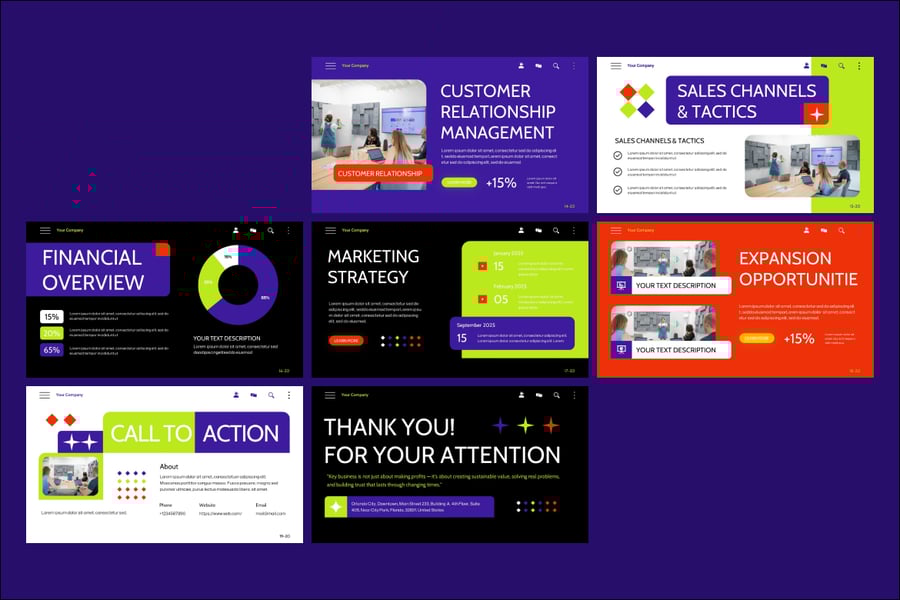 无论您是向投资者路演的创业公司创始人、汇报季度业绩的企业高管,还是提供战略洞察的顾问,这款 Google 幻灯片模板都能让您的信息更具影响力和说服力。它完全可自定义,您可以轻松拖放编辑颜色、字体和布局,使其与您的品牌形象完美契合。该模板包含专业设计的幻灯片,采用现代布局、引人入胜的图形和可编辑图表,增强了故事叙述和数据可视化效果。这款模板可完全自定义,适用于任何行业,助您打造引人注目、效果显著的精彩演讲。适用于关键业务演示、企业演示模板、商业计划书、公司简介、投资者路演、创业公司演示、项目规划、公司会议和商业战略演示等。