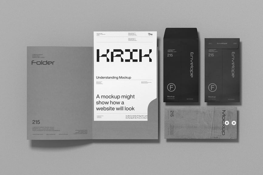 这套样机包含文件夹、信封和印刷纸张,适用于品牌和办公用品展示。它适合展示商业材料的布局结构和标识设计。