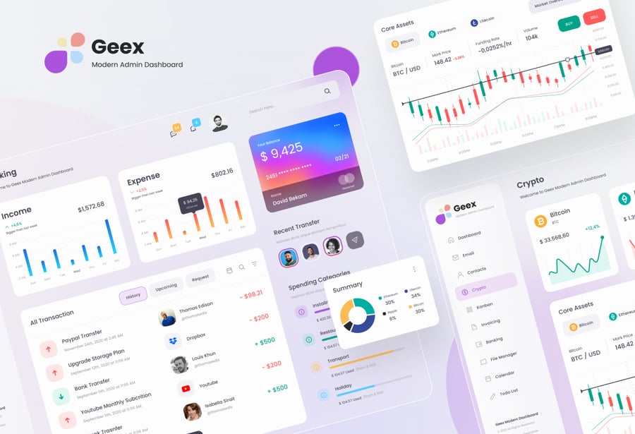 Geex 现代友好的管理后台设计灵感源自 macOS Big Sur,提供 Figma 格式文件,并包含“帮助”或“指南”文件。您可以使用 Figma 和 Adobe Photoshop 应用程序,根据公司或个人需求编辑和自定义模板。