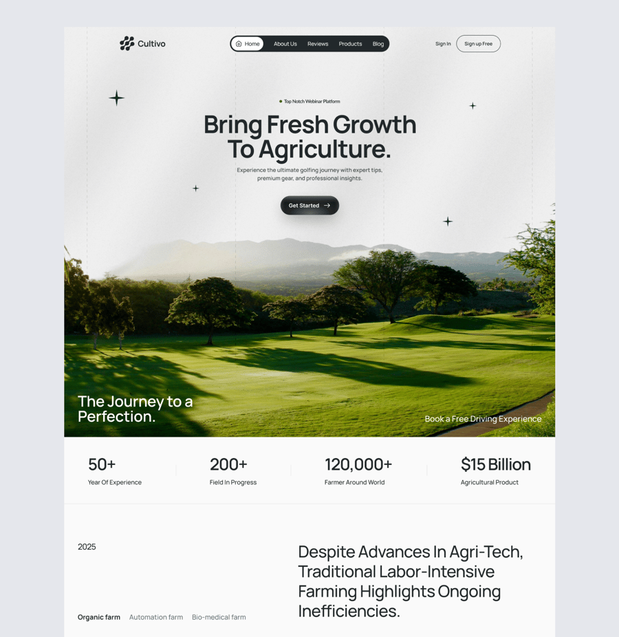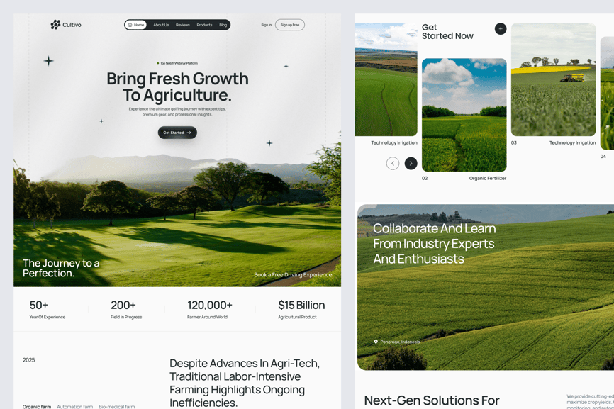 Cultivo 是一款农业主题落地页 UI 套件。落地页包含 6 个部分:首页、产品展示、有机农场、新一代产品、行动号召 (CTA) 和页脚。