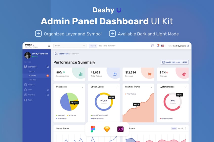 高品质的精美仪表盘 UI 套件。易于在 Figma、Sketch 和 Adobe XD 中使用。此模板将帮助您开发设计出色的应用程序。该套件的设计理念是将所有图层和组件整齐地分组在一起。