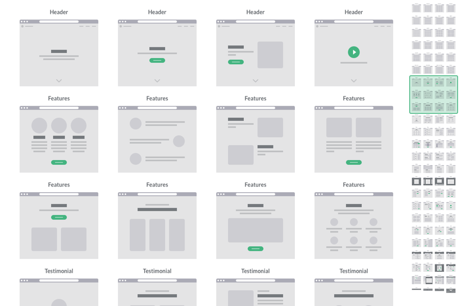 此套装中包含的卡片基于最受欢迎的类别,涵盖:标题、功能、客户评价、团队、定价、博客、文章、图库、电子商务、作品集、行动号召 (CTA)、联系方式、社交、注册/加入、设置、仪表板和页脚。