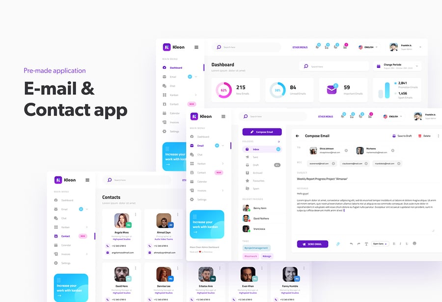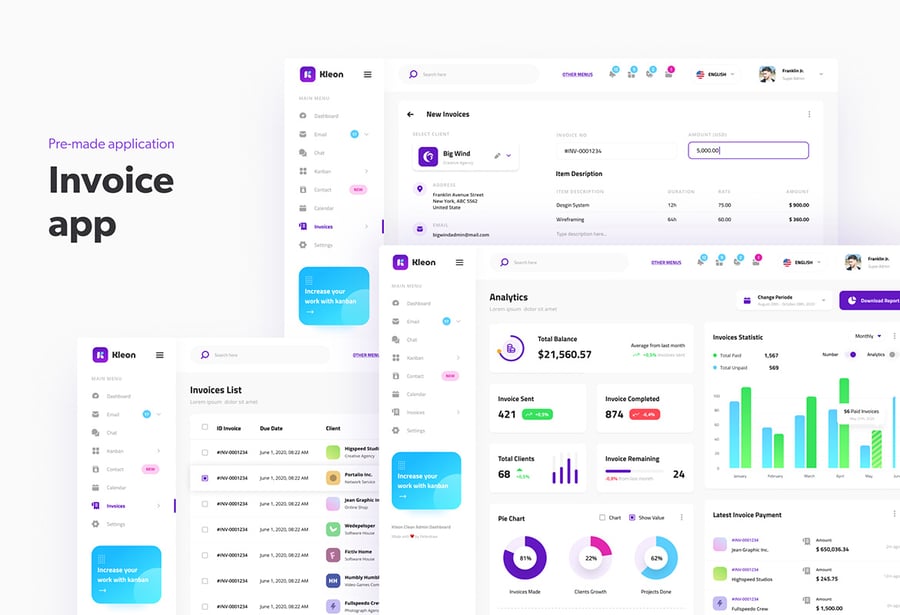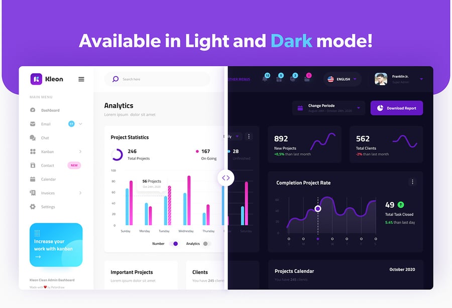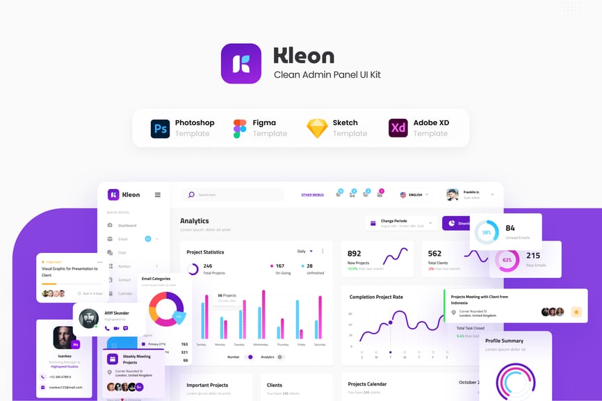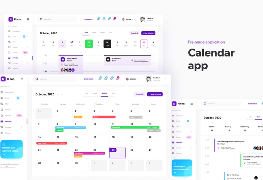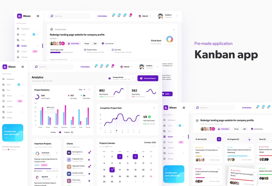 简洁的后台管理面板用户界面设计模板,适用于现代仪表盘。此模板非常适合用于电子邮件仪表盘、发票管理、日历仪表盘、看板仪表盘、项目管理仪表盘、SaaS 管理面板、团队管理仪表盘以及任何类型的后台管理网站。