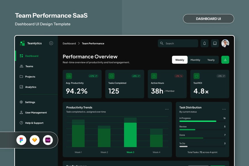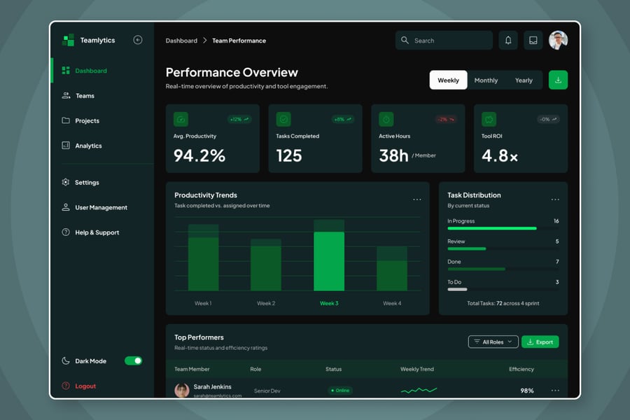 这款仪表盘用户界面专为注重产出和无缝协作的团队而设计,可帮助可视化日常生产力、任务流程和绩效趋势。它使管理者和团队能够保持高度一致,同时减少工作流程监控中的摩擦。该界面旨在将复杂数据转化为清晰直观的视觉效果,确保团队进度和瓶颈一目了然。