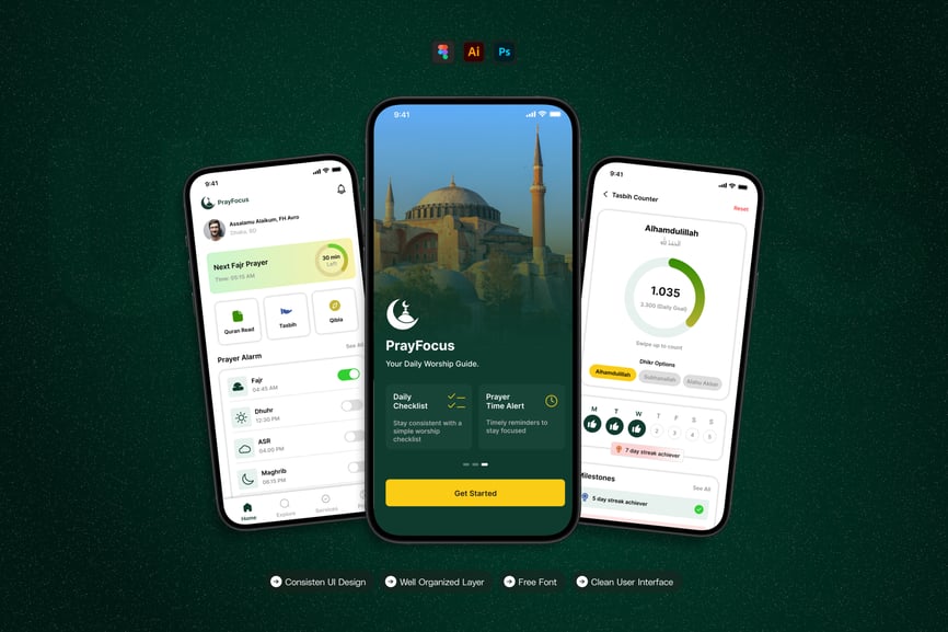 隆重推出 **Islamic Companion** 移动应用 UI 套件,这是一款现代化且功能全面的解决方案,可助您创建简洁易用的应用界面。对于希望加快设计流程的设计师和开发者而言,这款 UI 套件堪称完美之选,它将您所需的所有基本组件整合在一个井然有序的软件包中。