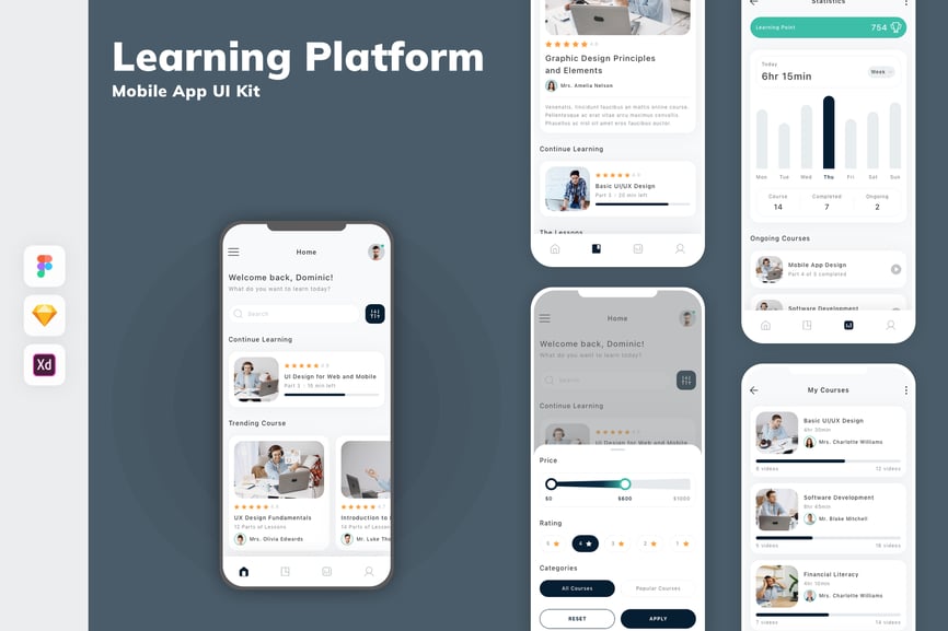 我们的 UI 工具包经过精心设计,可完美适配 Figma、Sketch 和 Adobe XD。所有文件都组织有序,命名规范,因此您可以轻松修改任何设计。