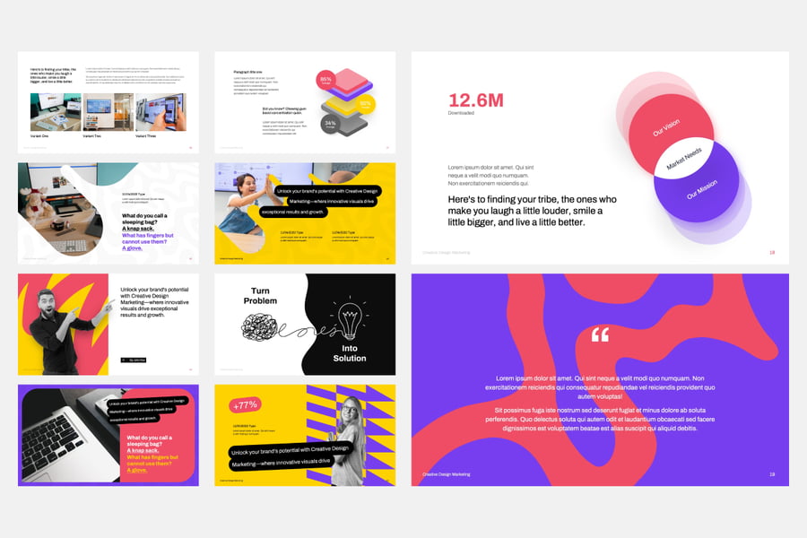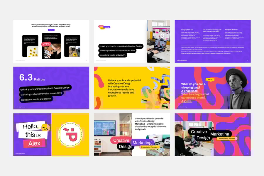 “相关性和使用案例”非常适合用于创意设计营销演示、大胆的视觉推介幻灯片、品牌提案 PowerPoint、营销活动幻灯片、充满活力的代理机构作品集、现代品牌战略模板、带有视觉效果的创业公司推介、色彩丰富的营销演示、创意内容展示、自由职业设计幻灯片、品牌故事布局、社交媒体营销幻灯片、团队简介模板、视觉识别提案、营销战略演示、营销和设计套装、创意人员推介幻灯片、媒体品牌幻灯片套件、现代多彩演示、创新营销视觉效果。
