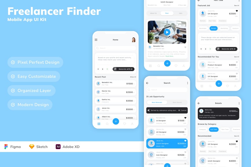 每个屏幕都可完全自定义,易于使用,并针对 Figma、Sketch 和 Adobe XD 进行了精心设计。