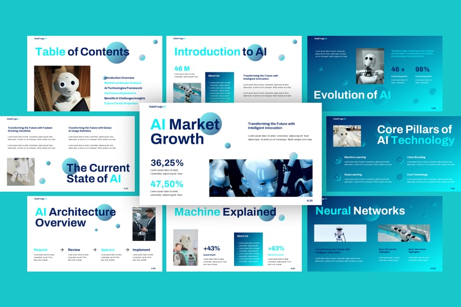 现代人工智能、数据与创新演示文稿,AI 技术 Google Slides 演示模板是一款现代、简洁且充满未来感的演示文稿,专为科技公司、初创企业、AI 开发人员、数据科学家、IT 专业人员和业务团队而设计。此模板可帮助您以引人入胜且易于理解的方式,清晰地展示人工智能概念、机器学习解决方案、数据驱动的洞察、自动化策略和未来技术趋势。