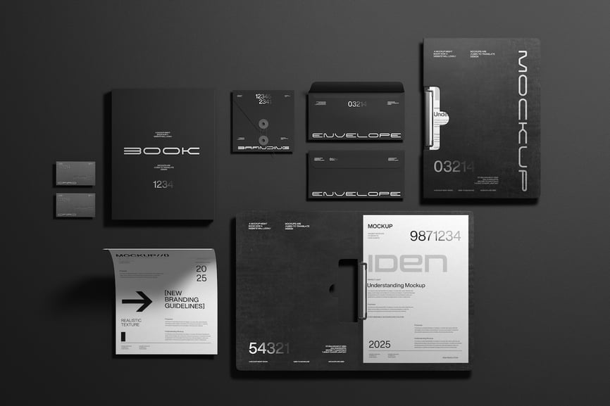 此模型展示了一套完整的企业办公用品,包括文件、信封和卡片,布局简洁明了。它适用于展示品牌系统、标识设计和办公用品概念。
