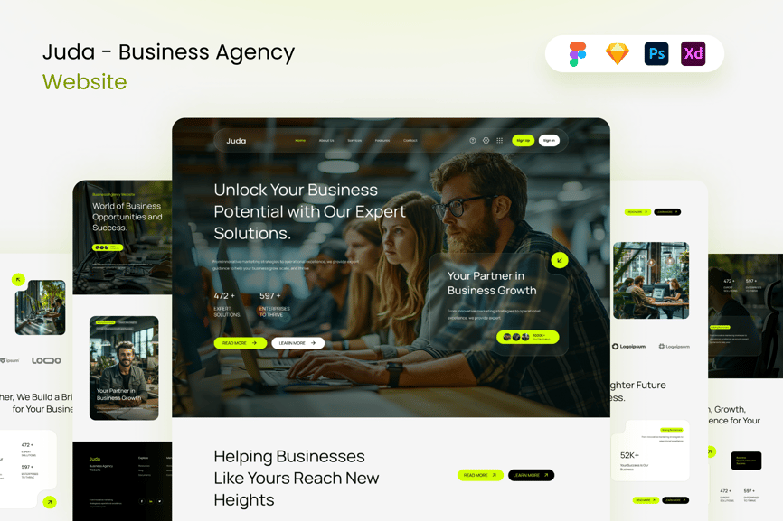 *Juda – 商业机构网站* 此模板简洁却不失专业与现代感。您可以使用 Figma、Adobe XD、Sketch 和 Adobe Photoshop 进行编辑。轻松插入内容、更改颜色,所有模板均已包含在内,可直接与您的受众分享。所有组件均基于矢量图,完全兼容、可编辑且像素级精准。此外,它们组织有序、命名清晰、分组合理。