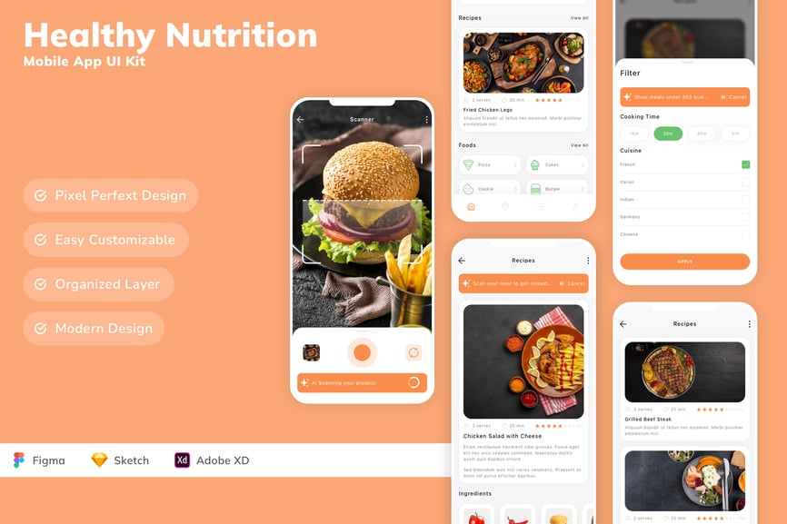 每个屏幕都可完全自定义,易于使用,并针对 Figma、Sketch 和 Adobe XD 进行了精心设计。