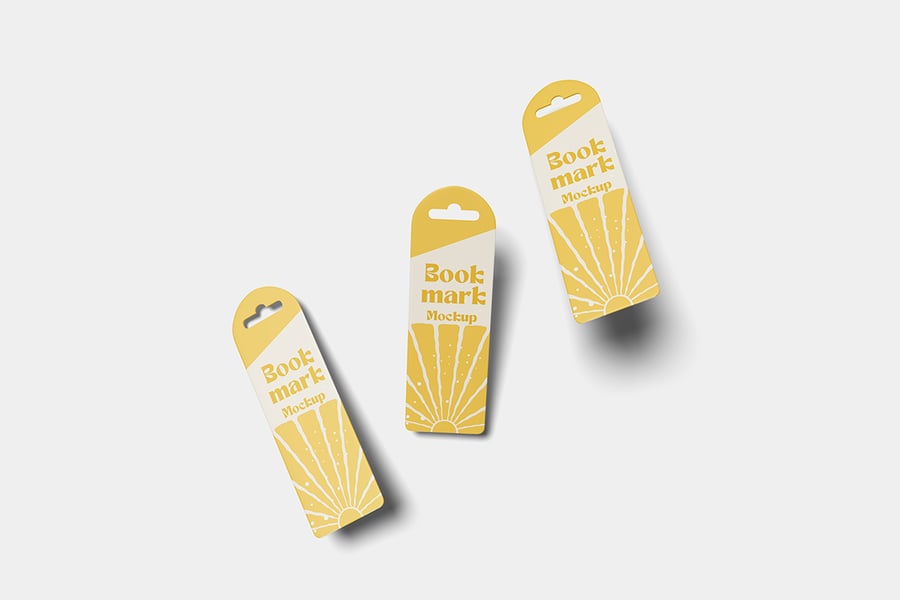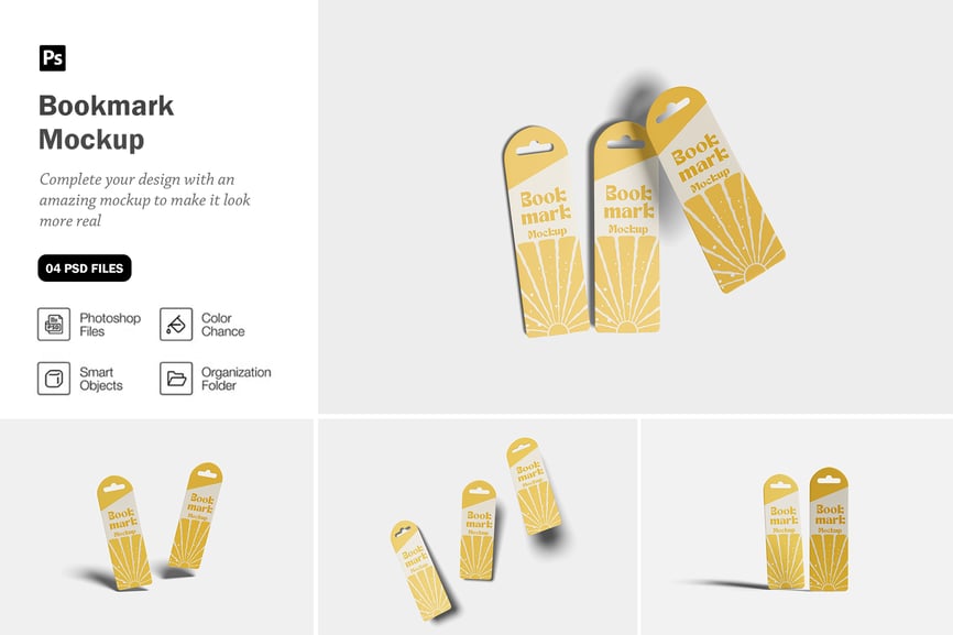 用这些精美的素材样机展示您的**书签样机**。此样机包含 4 个项目,每个项目都配有分层清晰的 PSD 文件。此外,此样机还采用了智能对象功能,这意味着您只需几秒钟即可轻松快捷地将当前设计替换为您自己的设计。