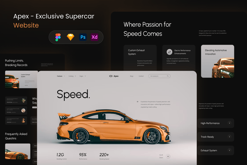 *Apex – 专属超跑网站* 此模板简洁却不失专业与现代感。您可以使用 Figma、Adobe XD、Sketch 和 Adobe Photoshop 进行编辑。轻松插入内容、更改颜色,所有模板均已包含在内,可直接与您的受众分享。所有组件均基于矢量图形,完全兼容、可编辑且像素级精准。此外,它们组织有序、命名清晰、分组合理。
