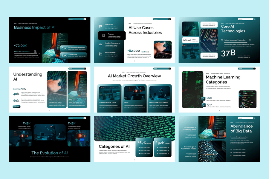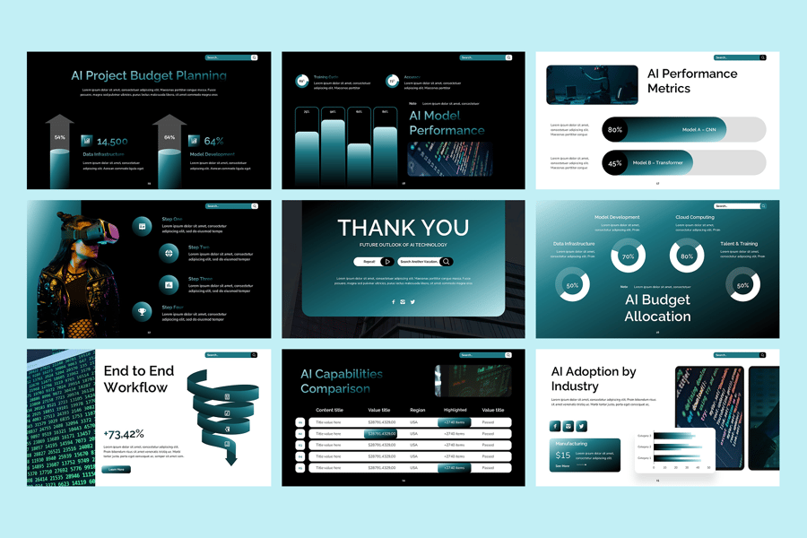 这款幻灯片采用现代未来主义设计,简洁的字体、科技感十足的图形、图表和数据可视化,每张幻灯片都可用于展示神经网络、模型工作流程、决策过程、关键绩效指标 (KPI) 和实时分析。视觉占位符清晰有力地阐释了人工智能驱动的解决方案、产品特性、行业应用和技术框架。该幻灯片可完全自定义,适用于人工智能幻灯片、机器学习演示模板、数据科学演示文稿、自动化技术幻灯片、人工智能创业公司路演演示文稿、智能系统演示、人工智能商业解决方案模板、神经网络信息图幻灯片、预测分析演示、企业人工智能提案、智能技术、人工智能创新演示、数字化转型人工智能演示文稿以及算法工作流程演示。