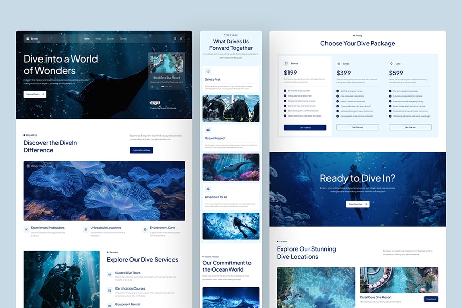 潜水品牌要想成功,关键在于让客户感到安全、专业且易于加入,而 DiveIn 的设计理念正是快速传达这些理念。其设计将引人入胜的水下视觉效果与清晰的结构相结合,让访客在保持兴趣的同时,也能轻松找到重要的细节。课程卡片和套餐部分使比较变得简单,而客户评价和关键指标则有助于新客户在预订前增强信心。