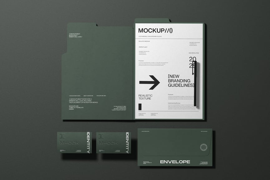 此模型包含配套的办公用品,例如文件夹、信封和卡片,用于品牌展示。它有助于展示具有一致印刷格式和比例的品牌标识布局