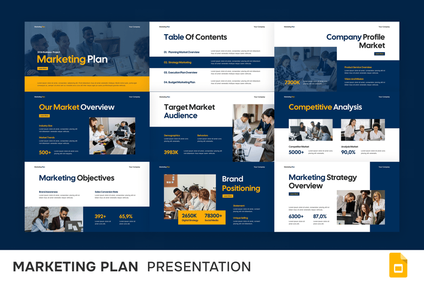 隆重推出我们的**营销计划谷歌幻灯片演示文稿**。此模板专为营销团队、初创公司、代理机构和商务人士设计,旨在帮助他们有效地沟通计划。模板提供结构化的布局,用于展示市场分析、目标受众、客户画像、营销目标、品牌定位、价值主张、渠道策略、活动策划、预算分配、时间表和关键绩效指标 (KPI) 等关键要素。