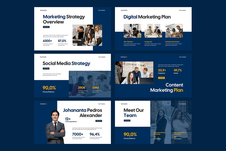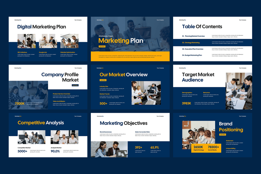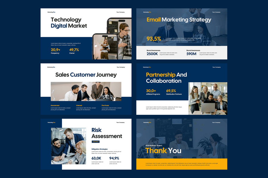 这款模板采用现代简洁的设计,搭配专业的字体、均衡的布局和引人入胜的视觉元素,每一张幻灯片都旨在清晰呈现数据驱动的洞察、绩效指标和战略举措。图表、信息图、漏斗图、时间轴和可视化框架能够精准地展现增长策略、客户旅程和营销活动效果。无论是内部战略会议、客户演示、商业提案还是高管评审,这款模板都能确保您的营销计划专业、有力且以结果为导向。