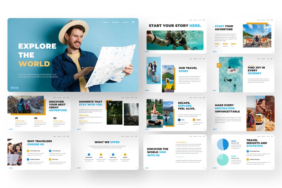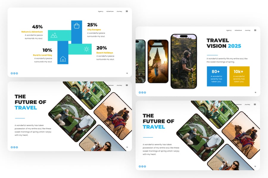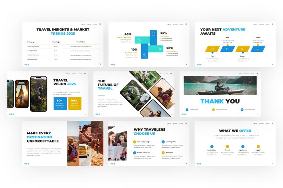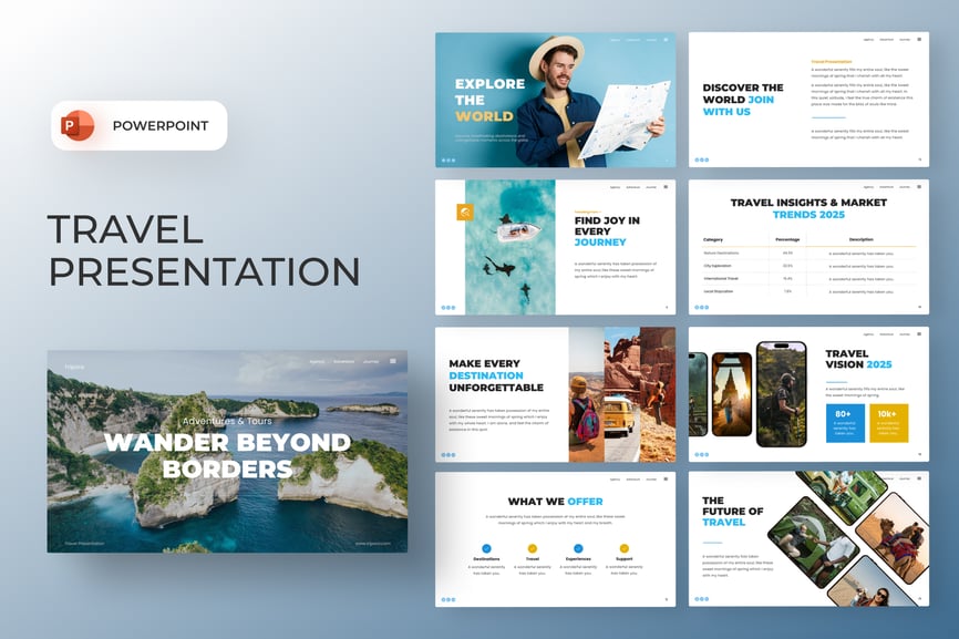Tripora 旅行演示 PowerPoint 模板是一款充满活力且专业的演示文稿,专为旅行社、旅游公司和探险品牌设计。它融合了简洁的白色布局、动感的摄影作品和醒目的蓝黄色调,营造出探索和兴奋的氛围。该模板包含旅行洞察、市场趋势、目的地展示、旅游套餐以及 2025 年旅行展望等版块。借助设备模型和数据驱动的图表,它将视觉叙事与专业结构完美结合,助您以极具感染力的方式展示旅行服务、客户旅程和全球探险机会。Tripora 模板可在 PowerPoint 中完全编辑,确保您获得现代、引人入胜且精美的演示体验。