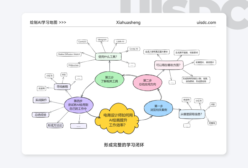 你可以再通过思维导图的方式,梳理自己的日常工作流程,想想其中哪些部分是可以用 AI 绘画辅助完成的,然后操作实践。这个过程肯定会有波折,最终也不一定会成功,但这一切都是独属于你的知识财富,会在之后的某一天帮到你,而这时的你也已经蜕变为一个专业的 AI 绘画达人了,至此我们的学习路径也完成了闭环。