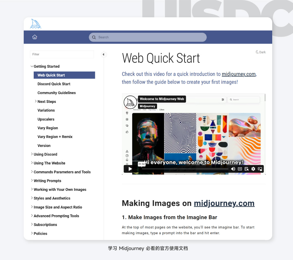 比如 Midjourney 就要一份非常全面细致的官方文档,里面对 Discord /官网的使用方法、提示词写法、各种功能/参数的作用都有详细的说明,附带图文和视频教程;只要你能用心看完这份文档,那么对 Midjourney 的掌握可以达到中上水平。