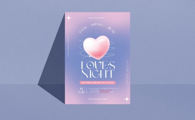 该模板适用于情人节活动的传单和海报设计。您可以利用该模板设计浪漫而温馨的传单和海报,通过渐变色彩和相关元素展现情人节之夜的活动详情和特别优惠,以吸引目标受众的注意和参与。- 805